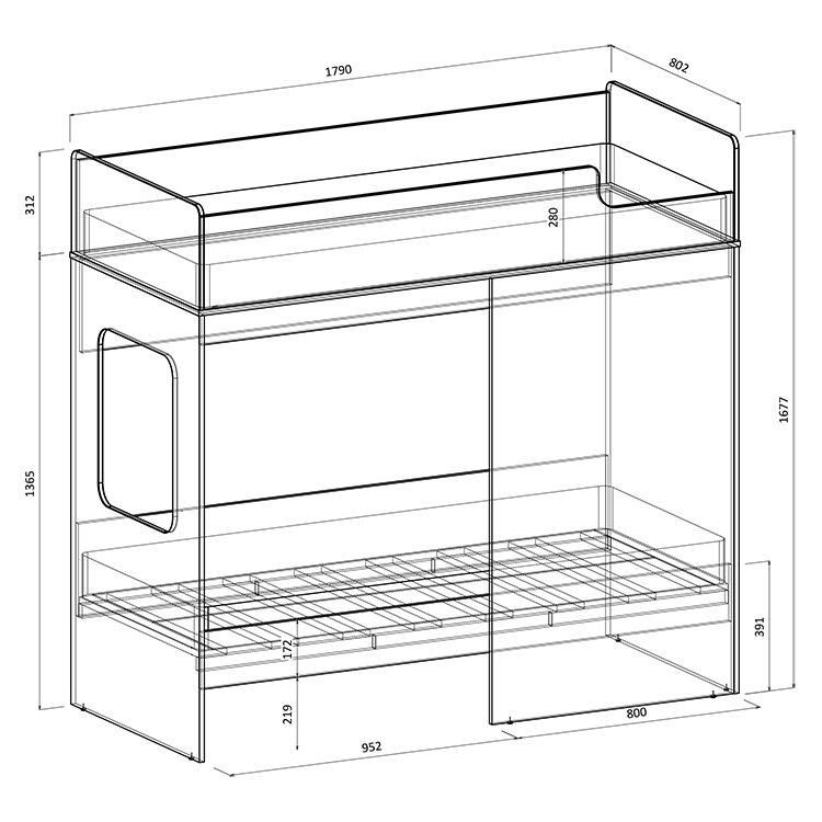 Кровать занимает немного места за счет фронтальной установки угловой лестницы. Это прекрасное решение для площади малых габаритов,экономия пространства.